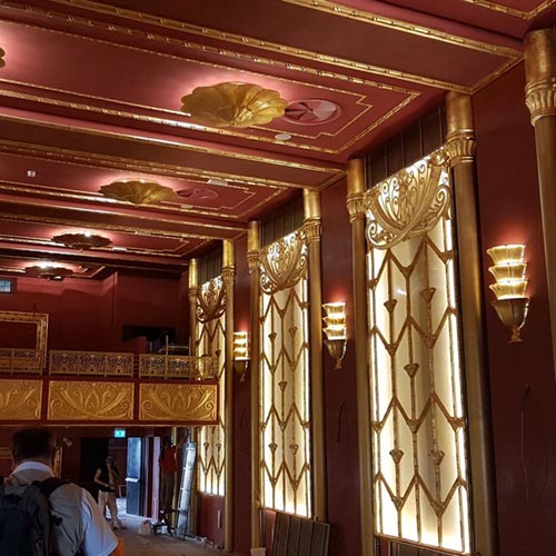 L’intervento è consistito nella realizzazione di decorazioni scenografiche a completamento dell’atrio di accesso e della sala principale a del cinema Fulgor su progetto redatto dal maestro dante ferretti tre volte premio oscar per la scenografia e sceneggiatore di cinque pellicole dirette dal regista federico Fellini.