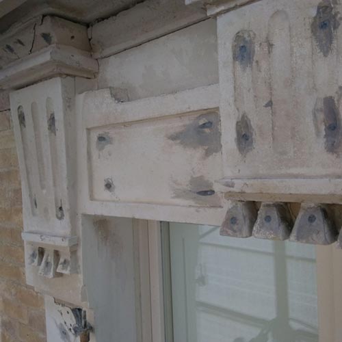 Nella seconda fase si e’ provveduto al fissaggio di tutti gli elementi decorativi mediante retro-iniezioni di resina fissativa e la successiva chiodatura con barre in vetroresina e carbonio fissate alla muratura con resine bicomponenti strutturali.